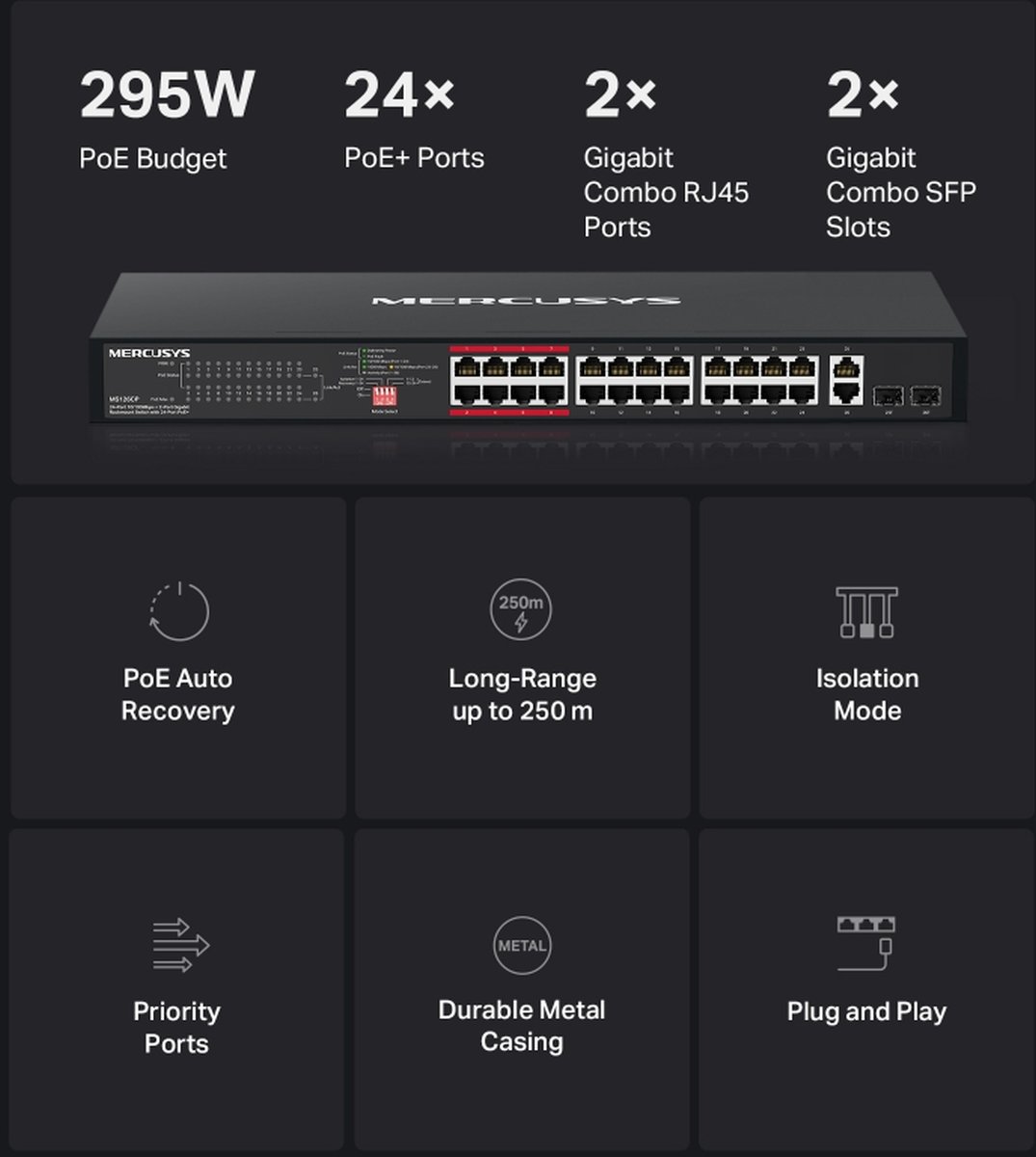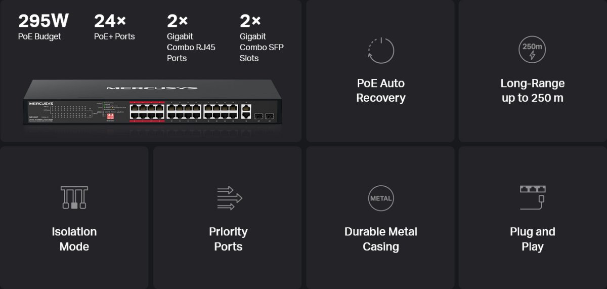 - Висок бюджет за PoE мощност с до 30 W за всеки PoE порт и 295 W за всички PoE портове