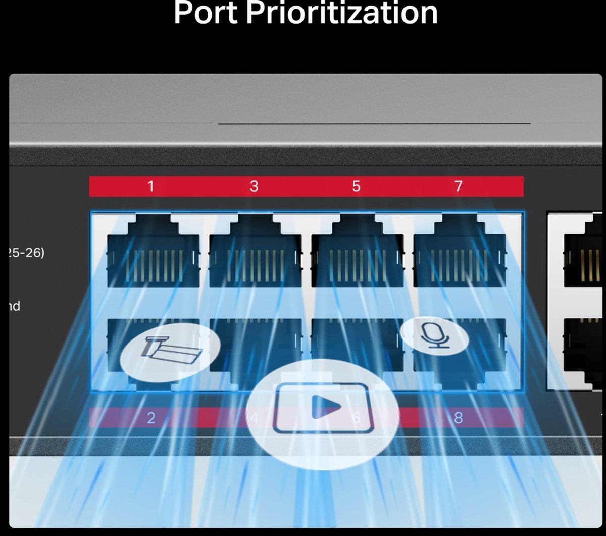 - Приоритетен режим за портове 1–8, за да се гарантира качеството на чувствителни приложения като видеомонитор