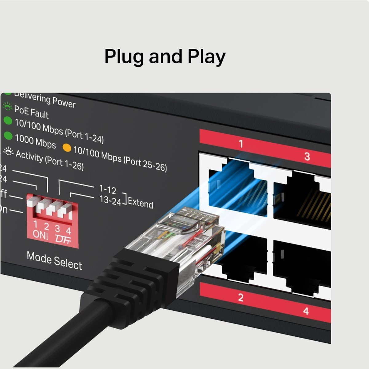 - 24× PoE+ RJ45 порта, 2× Gigabit non-PoE RJ45 порта и 2× Gigabit SFP слота