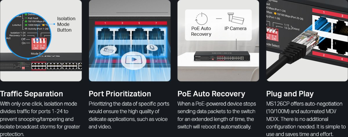 Това е автоматичен превод. Оригиналния текст може да видите тукMS126CP е 26-портов гигабитов комутатор за монтаж в шкаф с 24 PoE+ порта, идеален за IP видеонаблюдение за малки и средни предприятия с PoE бюджет от 295 W. Plug-and-play дизайнът го прави лесен за внедряване без необходимост от техник.