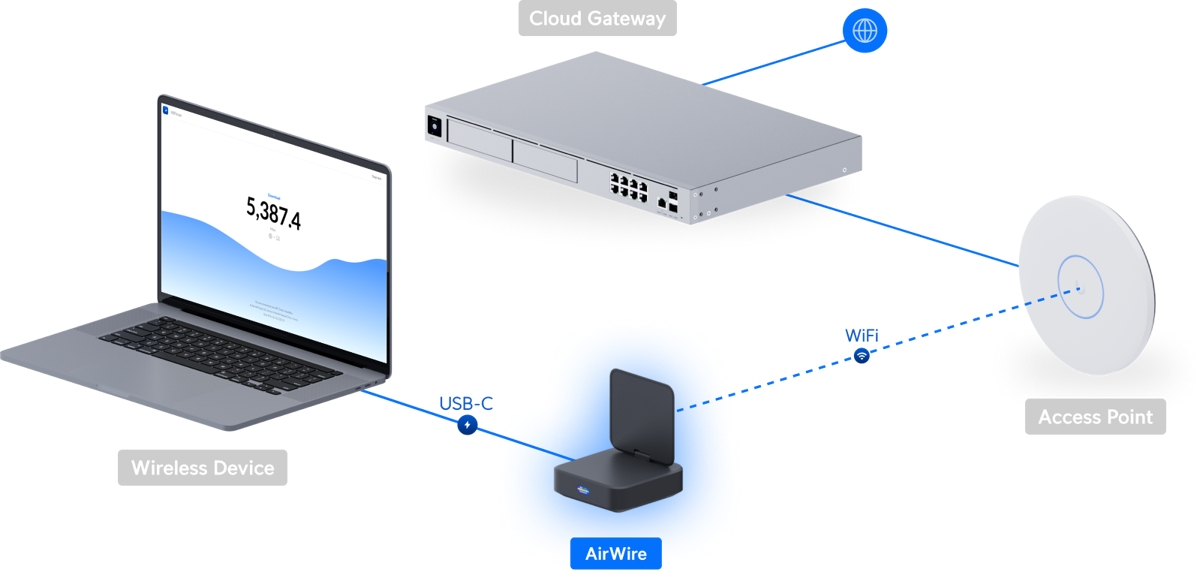 Ubiquiti U-AirWire е високоскоростен USB-C двубандов Wi-Fi 7 адаптер с вградена насочена антена, поддържащ STR MLO за едновременно, агрегирано използване на 5GHz и 6GHz честотните ленти , осигурявайки пълнодуплексна свързаност и значително по-висока пропускателна способност. В подобрен режим той постига скорости до 10Gbps (5Gbps пълен дуплекс). Изисква UniFi WiFi AP и е съвместим с по-стари модели, но функционалността STR MLO изисква UniFi U7 или E7.