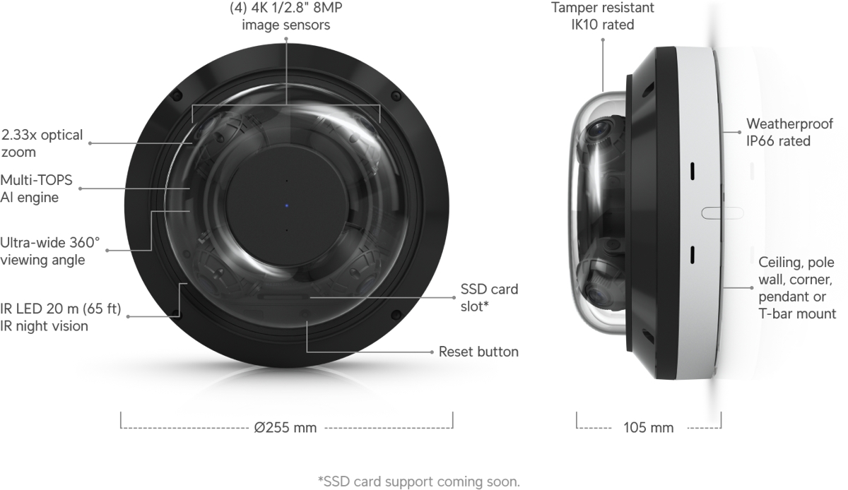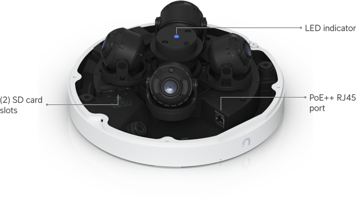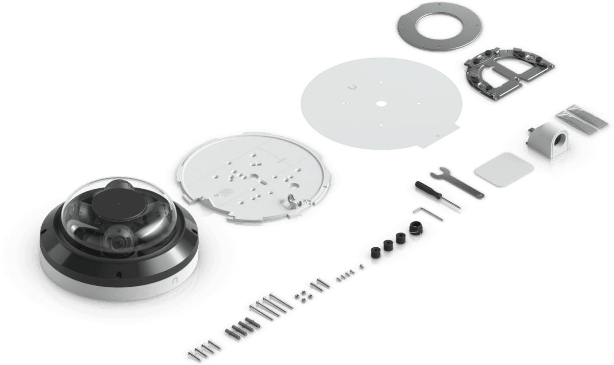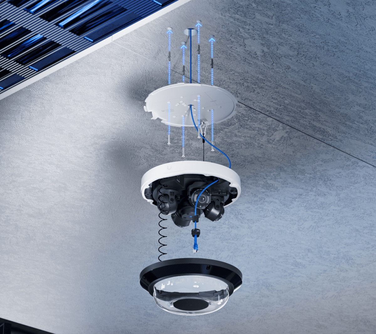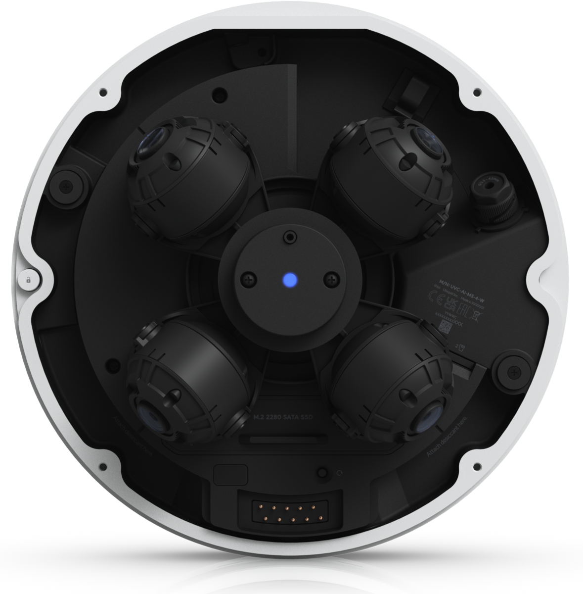 Панорамната хибридна IP камера Ubiquiti UniFi Protect UVC-AI-MS-4-W е оборудвана с (4) независимо регулируеми 8MP сензора (всеки 3840 x 2160 px) при 30 кадъра в секунда, осигуряващи общо зрително поле до 360° , адаптивно IR осветление за нощно виждане до 20 м и степени на защита IP66 и IK10 . Камерата може да бъде свързана към мрежата чрез 1Gbit LAN и поддържа PoE++ , с максимална консумация на енергия от 34.6W.